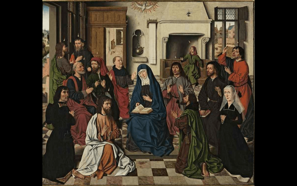 During this nine-day period, between Ascension and Pentecost, the Apostles gathered together with many other disciples who, by then, numbered about 120 persons, according to Acts (1:15); during this time Matthias is chosen by lot to replace Judas as an Apostle. On the tenth day, the day of Pentecost, the Holy Spirit is poured out upon the Apostles (Acts 2:1-13), and though the crowd spoke many languages, “each one heard them speaking in his own language” or xenoglossia (Gk. ξένος + γλῶσσα). Emboldened by the Spirit, Peter preaches the Pentecost sermon in that same chapter of the Acts of the Apostles, “Those who accepted his message were baptized, and about three thousand persons were added that day” (Acts 2:41).