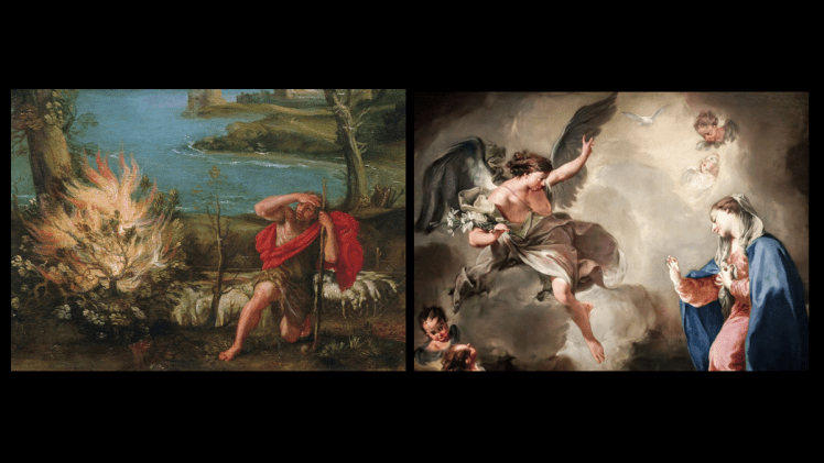 Such a connection has been made since at least the fourth century, when St. Gregory of Nyssa observed, “The light of divinity . . . did not consume the burning bush, even as the flower of her virginity was not withered by giving birth.” The burning bush or unburnt bush signifies the result of the Annunciation and Mary’s fiat, namely, the Incarnation of the Son of God. Just as the fire did not consume the bush, so the divinity of Jesus did not destroy His humanity. The burning bush, where God spoke to Moses, is perceived to be the typological parallel to the Annunciation and the Incarnation. The bush burned without being consumed, mirroring how Mary conceived the Word of God or Jesus as a virgin and remained perpetually so.