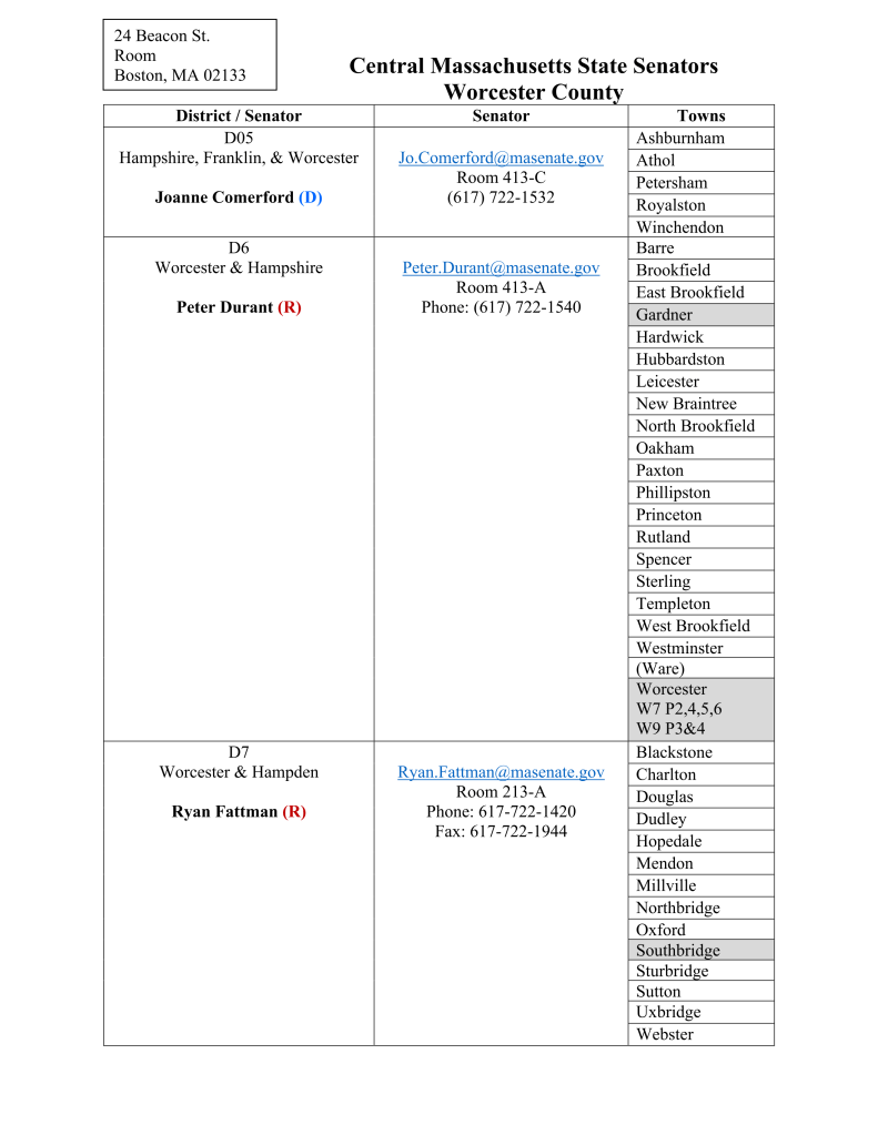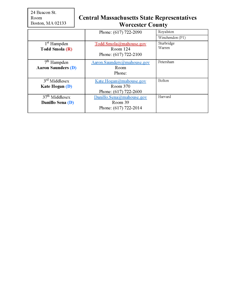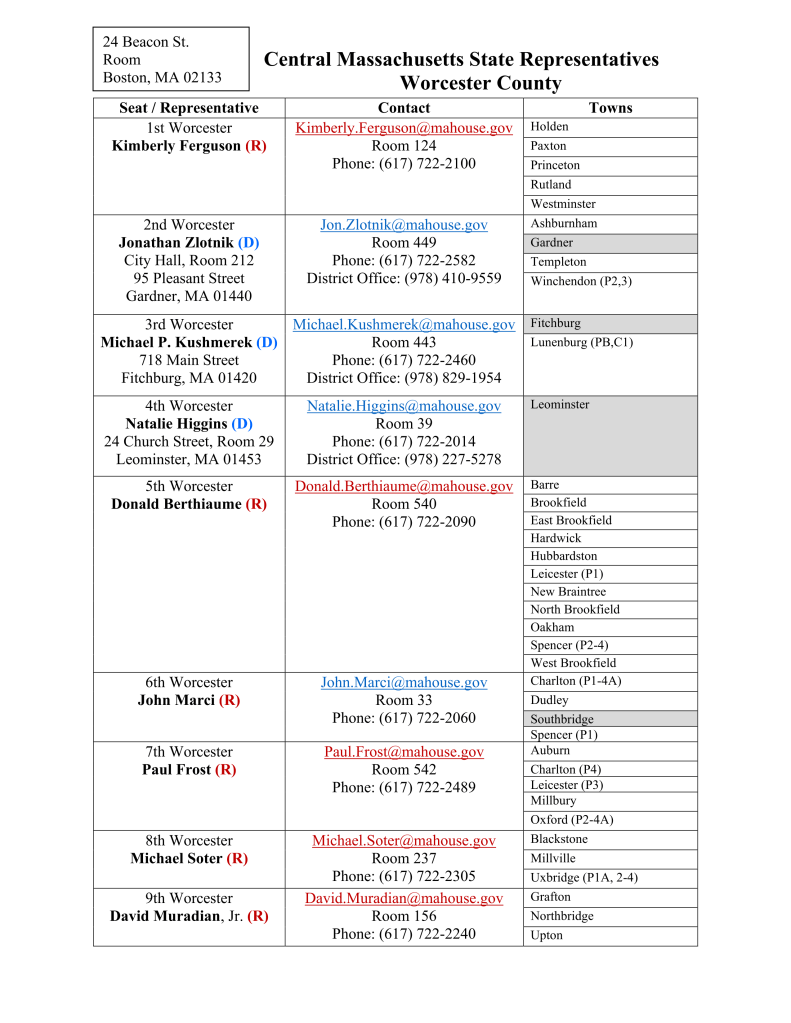 This page contains resources to get to know who the legislators are in Central MA, where there districts are, and how to contact them.